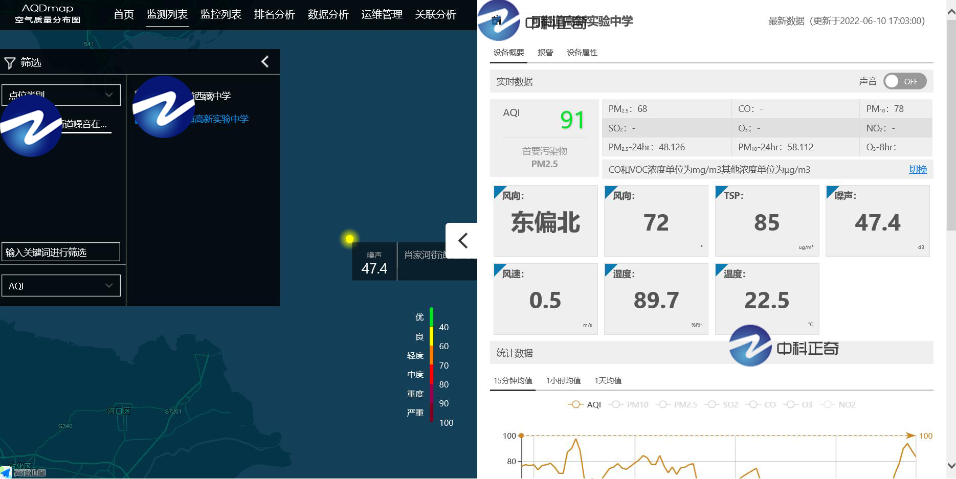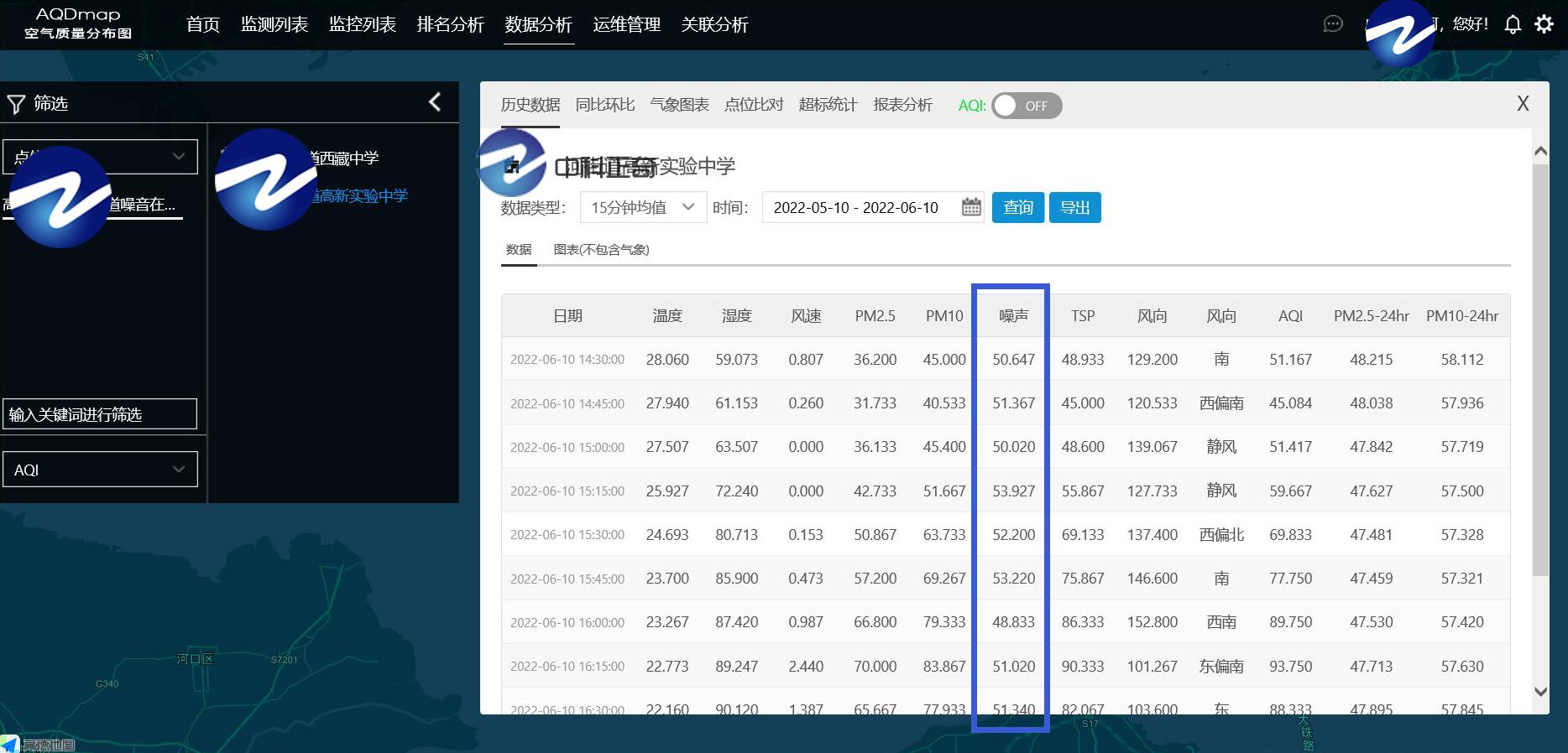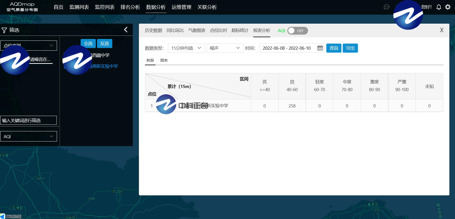 中科正奇ZK-ZS在線噪聲全自動監測系統,可根據各校需求增加PM2.5、PM10、噪聲、溫度、濕度等環境數據,結合智能云平臺界面可隨時隨地查看實時數據、歷史數據、同比環比、氣象圖表、點位比對、超標統計、報表分析、統計曲線、統計柱狀圖高效管理學校噪聲污染
