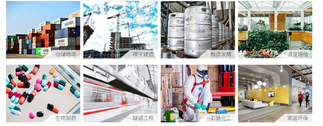 廣泛應用于石油化工、工業生產、冶煉鍛造、電力、煤礦、隧道工程、環境監測、污水治理、生物制藥、家居環保、畜牧養殖、溫室培植、倉儲物流、釀造發酵、農業生產、消防、燃氣、樓宇建造、市政企業、學校實驗室、科研中心等行業。