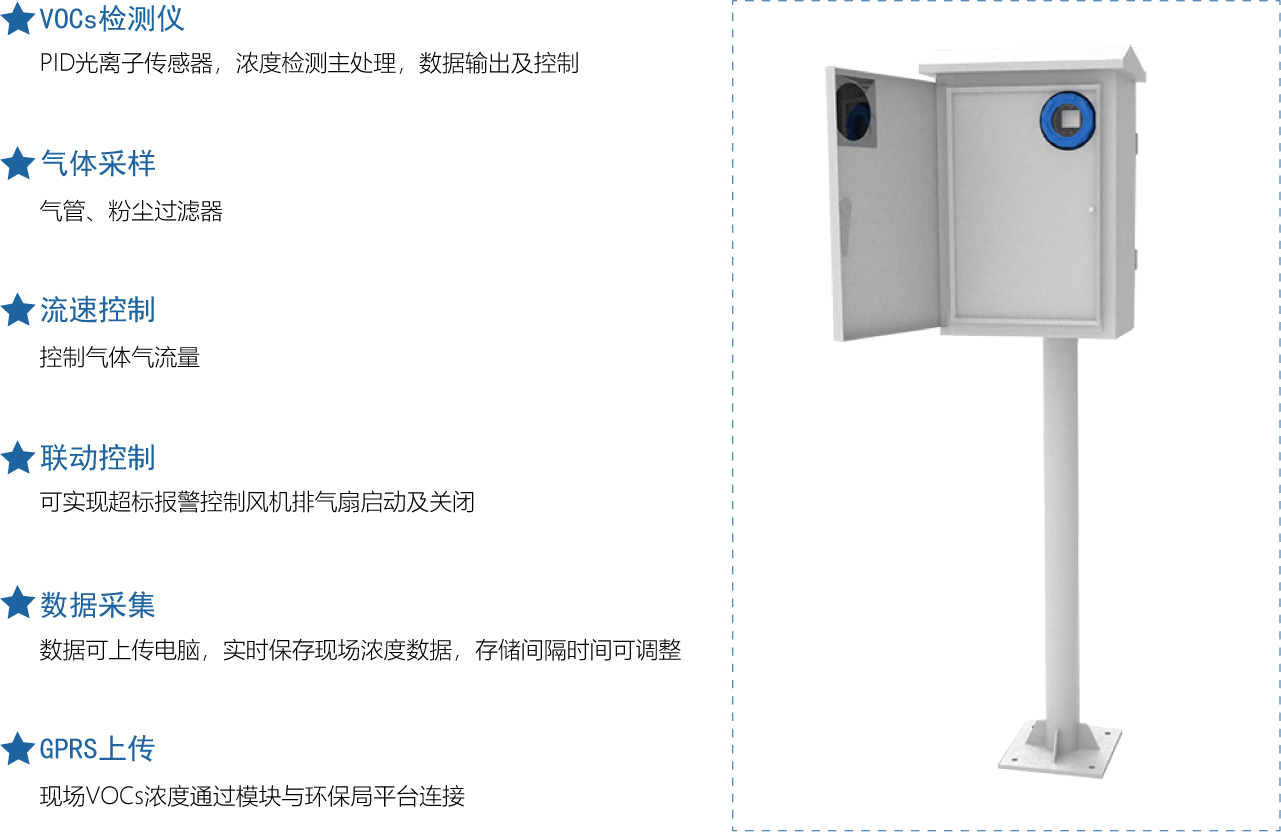 本系統適用于實時監測廢氣排放、廠界總揮發性有機物濃度等,儀器采用高精度光離子檢測原理傳感器,實時上傳至環保局管理平臺,以便環保局實時在線監測企業VOCs 排放情況。