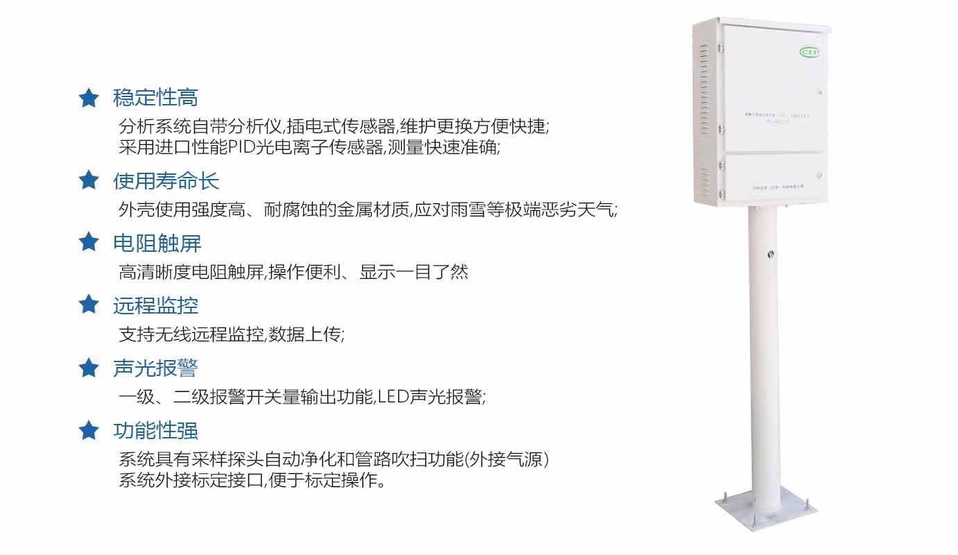 voc尾氣在線監測系統是多種揮發性有機化合物的總稱,采用獨創的核心算法,實現分辨率1ppb的高精度檢測,可達國控站監測指標,同時該設備獲得CCEP中環協認證證書 ,系統采用特殊方法采樣,氣體經過降溫、干燥、過濾預處理,再通過PID變送器測得氣體的VOC的濃度,另外還配置智能報警燈,當VOC濃度值超過設置閾值,自動啟動報警裝置,采用模塊化結構,安裝、操作方便。