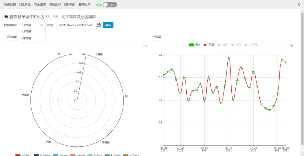 對特定點位選定時間段進行超標統計,以表和圖兩種方式同時顯示,通過圖可以直觀看到超標的情況,通過表可以詳細看到具體超標時間