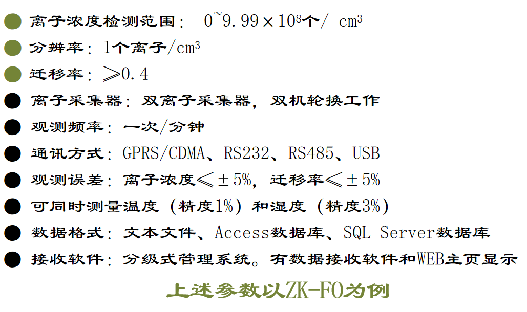 中科正奇ZK - F O 負氧離子監測系統按照國家林業局發布的” 空氣負( 氧) 離子濃度監測站點建設技術規范“ LY / T 2 5 8 7 — 2 0 1 6 標準自主研發,自主生產。 該產品設計使用最先進的雙重同心圓筒原理設計, 同時采用最 新“ J I S B ” 氣體離子密度標準, 滿足現行國際標準。