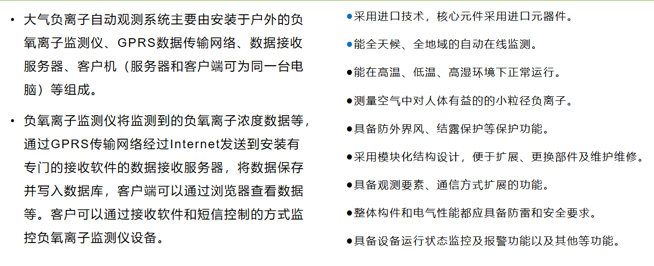 可對負氧離子、溫濕度進行監測, 并可根據客戶需求增加P M 2 . 5 、 P M 1 0 、噪聲、臭氧、二氧化氮、二氧化硫、一氧化碳、風速、風向 等等監測項目, 充分滿足環保局、旅游局對環境監測需要。