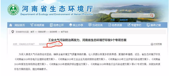2019年4月9日,河南省生態環境廳印發《河南省2019年非電行業提標治理方案》、《河南省2019年工業企業無組織排放治理方案》、《河南省2019年工業爐窯污染治理方案》、《河南省2019年揮發性有機物治理方案》、《河南省2019年度鍋爐綜合整治方案》、《河南省2019年鑄造行業污染治理方案》等6個專項方案。