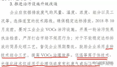 1)如2018年10月23日山西呂梁環保局發布“《呂梁市VOCs綜合治理專項行動方案》”,其中提及“低溫等離子技術、光催化技術僅適用于處理低濃度有機廢氣或惡臭氣體”,界定了技術適用范圍。