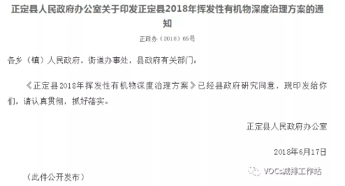 7)2018年6月,河北正定縣人民政府發布正定縣2018年揮發性有機物深度治理方案的通知。