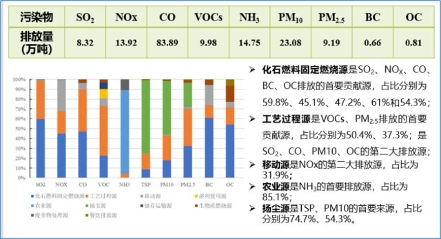 調查顯示,全區二氧化硫的主要排放來源是電力供熱、民用燃燒、建材行業和冶金行業。石嘴山市的排放貢獻最大,且無論是基于國土面積還是GDP,其排放強度均高于其他城市;其主要排放來源是碳素生產企業和冶金企業。全區氮氧化合物的主要排放來源是電力供熱、道路移動源、建材行業以及非道路移動源,排放貢獻最大的是銀川市,道路移動源、非道路移動源、電力供熱行業是銀川市氮氧化合物的首要貢獻源。全區PM2.5的主要排放來源是電力供熱和冶金行業,排放貢獻最大的是吳忠市,其主要排放來源于冶金行業。全區揮發性有機物排放貢獻最大的是寧東能源化工基地的石化與化工行業。