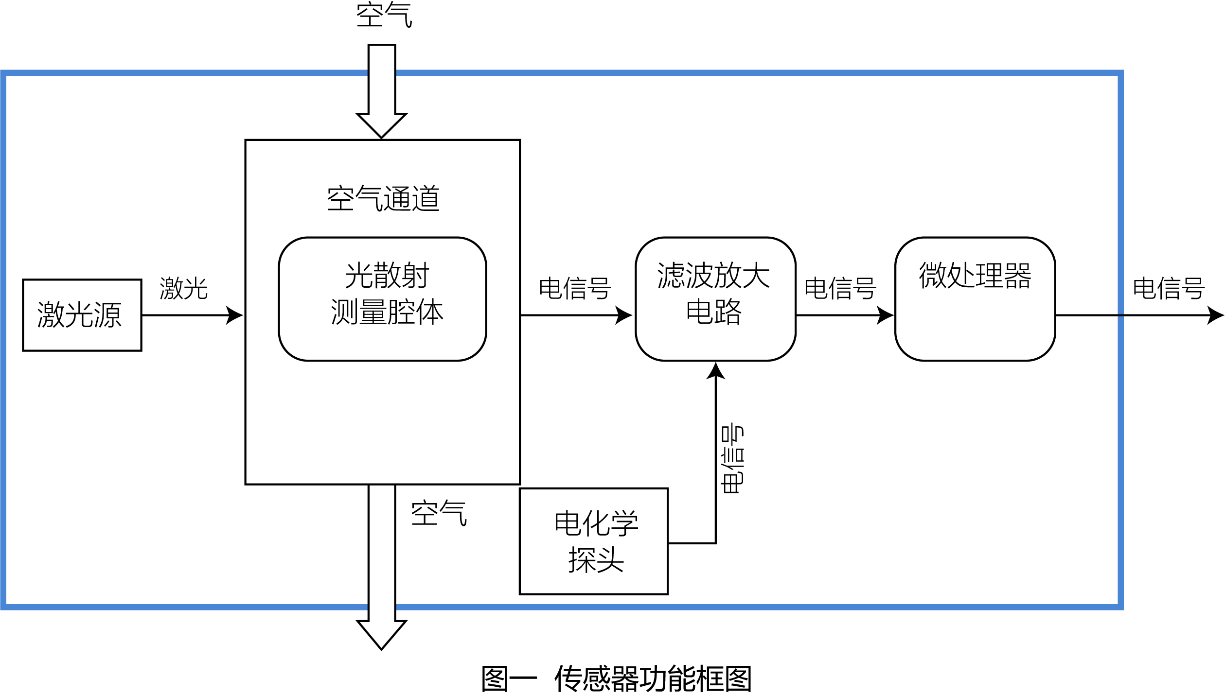 本傳感器采用激光散射原理。即令激光照射在空氣中的懸浮物顆粒上產生散射,同時在某一特定角度收集散射光,得到散射光隨時間變化的曲線,進而微處理器利用米氏(MIE)理論的算法,得出顆粒物的等效粒徑及單位體積內不同粒徑的顆粒物數量,傳感器各功能部分分框圖如圖一所示。