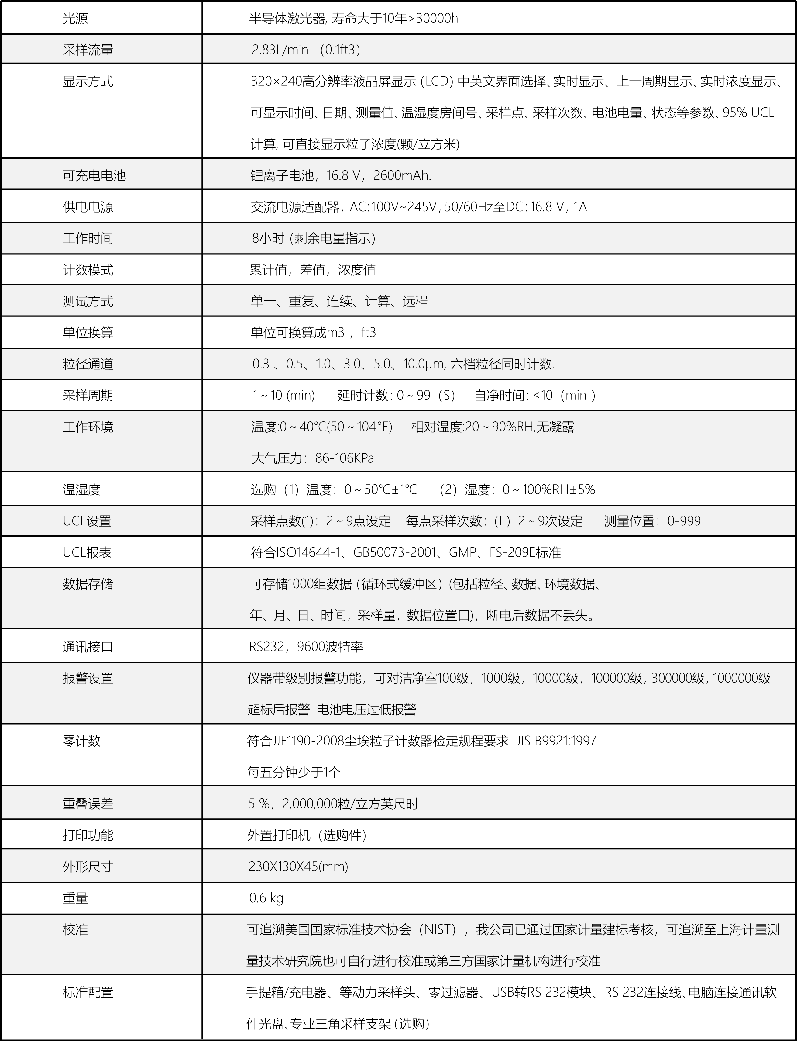 ZK-CLJ-E型塵埃粒子計數器的技術指標均滿足國家計量總局頒布的JJF1190-2008檢定規程的要求,整機功能采用美國微電腦控制處理技術及國際上最先進的SMT芯片貼片封裝技術和半導體激光傳感器技術及防噪聲氣泵,準保數據精度達到最佳。